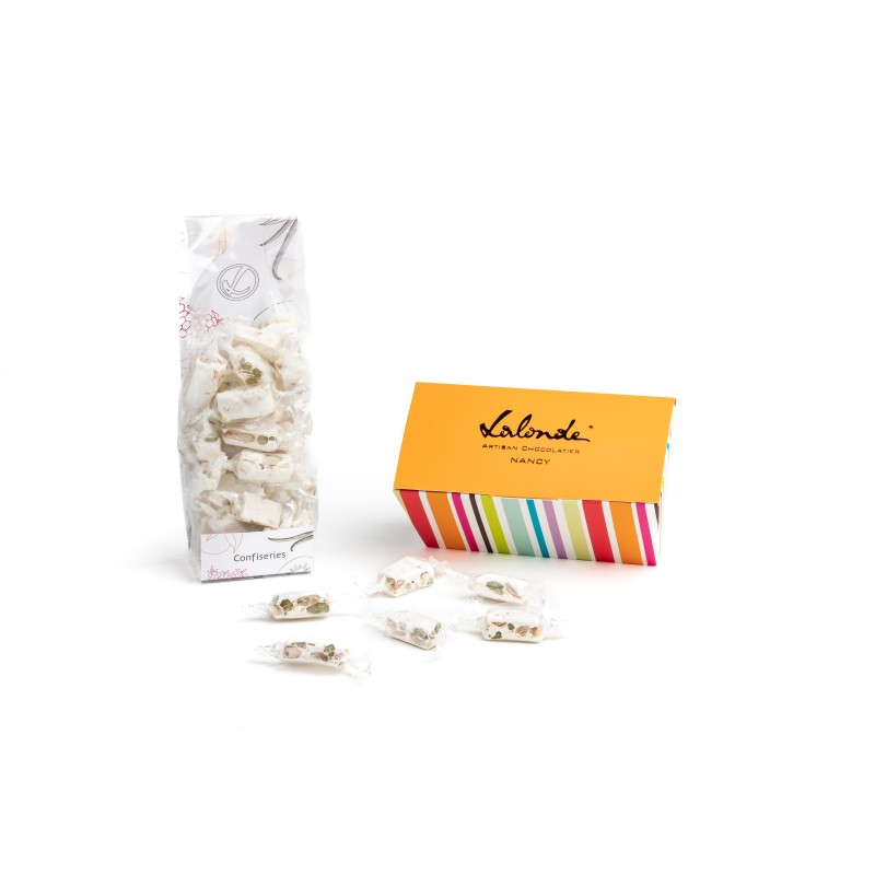Ingrédients : miel, sucre, sirop de glucose, amandes, pistaches, blancs d'oeufs.